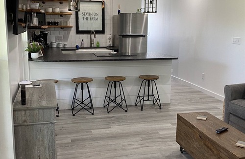 Welcome to Stayin on the Farm, a private and exclusive 40-acre country retreat. To reach us, you'll need to take a long winding road that passes a small chapel and goes over a pond. Once you arrive, you'll be delighted to snuggle up in our brand new barn guesthouse. The guesthouse is all yours and includes a bedroom, family room, kitchen, and bathroom. This is not just any old barn guesthouse; it has all the modern amenities of the 21st century. Don't forget to check out our other location, Stayin On Main, located in Historic Springboro.