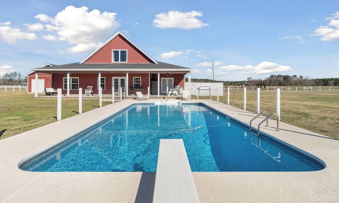 The Barnhouse Retreat offers the ultimate blend of comfort, space, and amenities for your next group getaway. This beautifully designed barndominium features a full-service gourmet kitchen complete with a large island, double ovens, a full-size refrigerator, and all the essentials needed to cook for a crowd. With five spacious bedrooms and five bathrooms, everyone has their own space to unwind—three of the bedrooms are primary suites with private baths, and the other two share a convenient Jack-and-Jill setup, giving each room private bathroom access. The open-concept living and dining area is perfect for gathering, with ample seating and Roku TVs in every room for relaxing after a day of fun. Step outside to your private oasis, where a massive 18x36ft in-ground swimming pool with a 9ft deep end and diving board awaits. The large patio area includes a second refrigerator, BBQ grill, porch swing, swing set, and plenty of space for outdoor entertaining. Best of all, the home is dog-friendly and features a large backyard—perfect for four-legged guests. Whether you're celebrating a special occasion or simply soaking up the quiet countryside, The Barnhouse Retreat is designed to make your stay truly unforgettable.