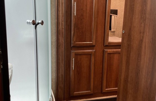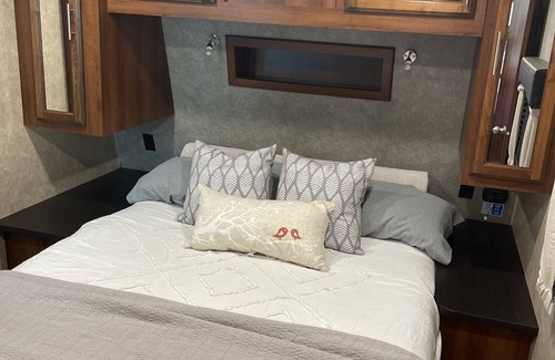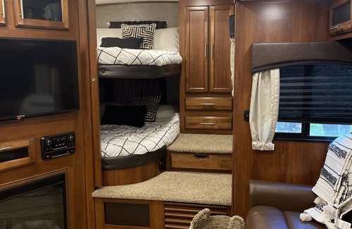 This is a new clean RV with a Bunkroom, an outdoor kitchen, 2 Refrigerators, a separate Master Bedroom, fireplace and enclosed shower. It is located at the base of campus just a quick stroll to the Lumberyard Food Court. Perfect for your event weekend or quick stay!