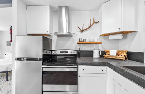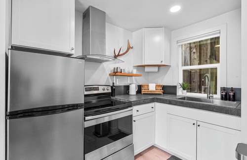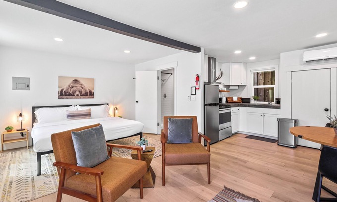 This remodeled studio cabin is spacious, open, and naturally lit (4 windows)! Mountain modern finishings with updated kitchen and bathroom, new lighting, paint and furnishings throughout while maintaining the rustic beauty of this cedar lodge. Includes brand new super comfy King bed and 4k HD TV! Lightning fast WiFi with 500 mb speeds and off street parking is included right in front of this unit.