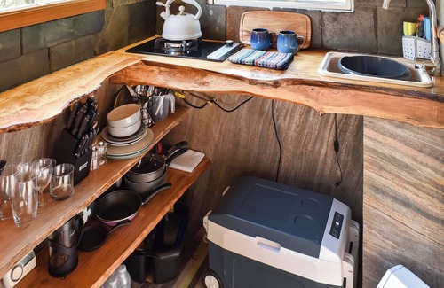 Shower Room: Walk-In Shower, Toilet. Heating by wood burner, electricity by solar power, LPG gas, bed linen and towels included. Initial fuel for wood burner included. Wood fired hot tub for 2 (private). Private parking for 1 car. No smoking. Please note: This property is accessed via a rough track.. These shepherd’s huts have been built with the environment at the heart of their design - over 80% of the materials used for the build being recycled upcycled or reclaimed, all being sourced locally. The shower runs off collected rainfall, the toilet is composting (you will see no difference!) and electricity is by solar power or local green energy (seldom needed). You can see the wind farm from where power is created and this provides a minuscule carbon footprint. The huts are cosy with all fundamental facilities provided; traditionally meals would be created on top of the wood burner, and you are encouraged to give this a go using the cast iron crockery provided.
