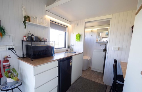 A cozy 190-square-foot tiny home and family friendly accommodation with easy access to water, split air conditioning, a kitchenette, cooking equipment, and excellent bathroom facilities. These amenities include eco-friendly compost toilet, hand basin, and shower (gas heated for hot showers).