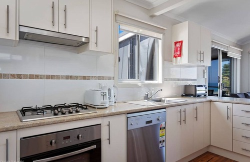 A stunning cabin with 2 bedrooms offering a balcony to sit, relax and soak in the views of the ocean which is only a short stroll away. Comprising an open plan design, the kitchen is fully equipped with everything you need to prepare your own meals during your stay, with cutlery/crockery, pots and pans, dishwasher, microwave, toaster, fridge/freezer, tea/coffee facilities. Guests are required to bring their own food to cook and enjoy. The living area is comfortable with a split system heating/ac unit and overlooks the balcony and has a television, DVD player and offers plenty of books and games for the family to enjoy. There are 2 bedrooms, the master has a queen bed and the second bedroom offers a tri bunk (double on bottom and single on top). There is a central bathroom servicing the bedrooms.