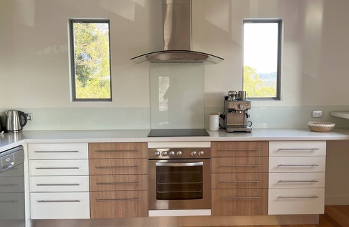 Wander up the stairs and you arrive at a large open plan room, with views out across Binalong Bay and up the Bay of Fires. You can also see Grants Lagoon, and the National Park beyond. In this area, there is a large comfy lounge suit, flat screen TV, dining table, and an indoor/outdoor breakfast bar/servery. Lots of DVD's to enjoy. Reverse cycle Air Conditioning keeps the area warm in winter, and cool in summer. The modern kitchen is fully equipped, for a family stay. There is an outdoor deck set among the gum trees with beautiful views up the Bay of Fires.