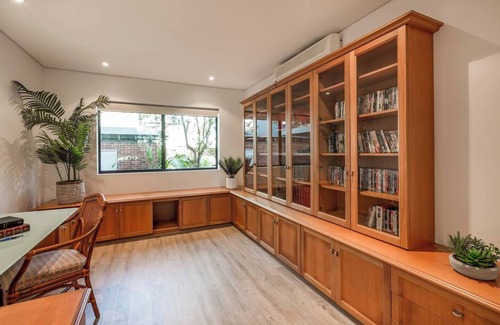 The ground floor features an open-plan living, dining, and kitchen area filled with natural light with wall-to-wall windows showcasing the lush greenery outside, while a gas fireplace and Smart TV with Foxtel, Netflix, and Stan create the perfect cosy setting. The formal dining corner seats ten, while the chef’s kitchen offers premium appliances, ample bench space, and a butler’s pantry. Meanwhile, the undercover patio extends the living space outdoors, offering a large dining table and BBQ, surrounded by the peaceful backyard.