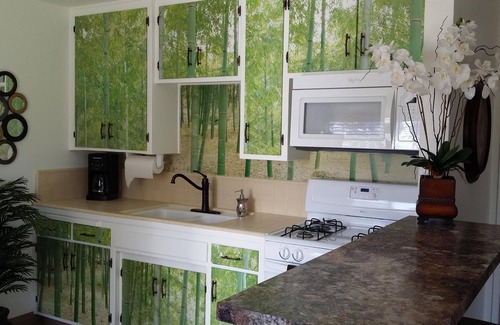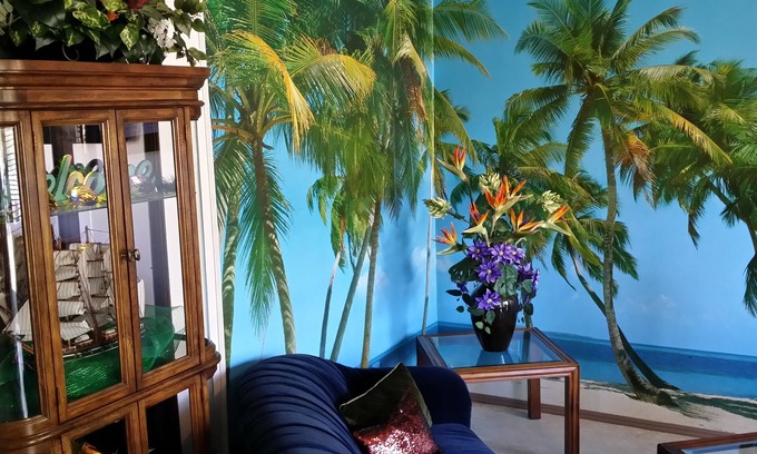 Identity verification and credit check required before check in. Beautiful Tropical Beach Murals in every room of this all brand new, centrally located home with grocery stores restaurants and shops within walking distance. Full sized automatic garage right off the kitchen. Free wifi, huge closets, lots of drawers, Master bedroom has Queen pillow-top bed, second bedroom has Full-sized pillow-top electric adjustable massage bed. All welcome, bring your pet - huge front lawn out your front door and private dog run through medium pet door.