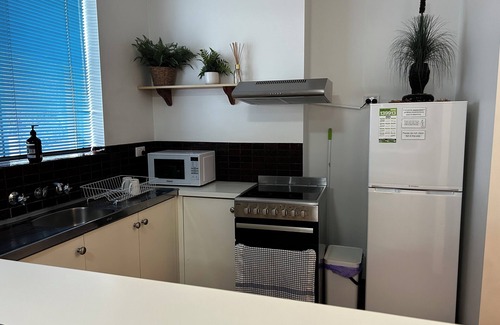 Comfortable Self Contained 2 bedroom BEACH-FRONT apartment, fully equipped kitchen, sleeps 4, Queen size bed in master bedroom, 2 single beds in second bedroom with room for cot (not supplied), all linen supplied, air-conditioned, LCD Colour TV, DVD player, CD player + radio. Equipped kitchen. Take a swim in the onsite pool or at the beach just foot steps from the apartment. Stroll 5 minutes along the beach to the central shopping area, playgrounds, restaurants and cafes. WIFI on site. Kitchen