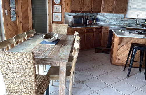 We have great surf fishing right outside the door. You can watch your pole from the house deck. Surf fishing when the reds are running is very exciting. Bring your catch back to the fish cleaning table under the house, cook on the charcoal grill provided & dine on your catch outside on the deck on one of the 3 outside tables. In the house I have a dining for 8 plus 4 bar stools. The large open area has fabulous views of the water from the large windows & sliding glass doors. After dinner sit in one of the 8 balcony height poly resin chairs or any of the other chairs provided with a panorama view of the gulf. U can choose to sit in the covered entrance area upstairs with chairs, & a table with a cool drink & great view of the gulf. Plenty of other chairs to use. You can go up higher onto the eagles nest where u can see forever. The best place to watch the fireworks!! Please supervise your children & stay off of the roof!!