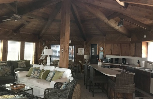 The living room is one large open area. The living room has plenty of seating with 2 sofas, one is a queen pull out, chairs & a TV, dining table with seating for 8, 4 bar stools. You can be part of the action while cooking or dining. A great room with plenty of seating to be together.