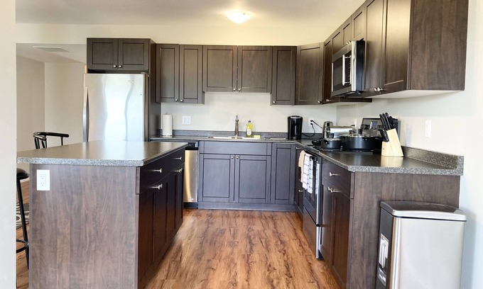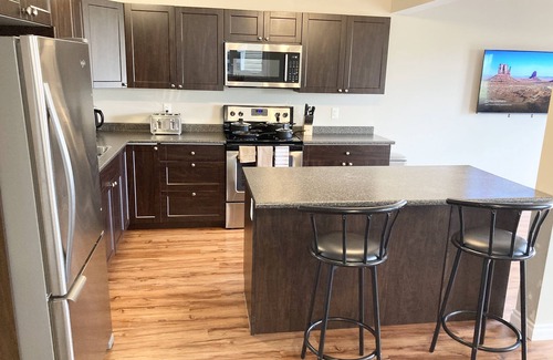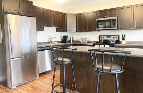 * Kitchen: Our fully stocked kitchen is perfect for long-term stays! Cook your own delicious meals. Loaded with pots, pans, plates, mugs, bowls, utensils, condiments, and cooking and baking supplies.