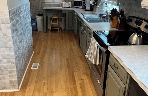 Inside on the main floor there is a large equipped kitchen, a full bathroom, a living room with a TV / firestick and two bedrooms (King bed / 2 twins). The second floor has a half bath and three bedrooms (Queen / King / Queen). The house also has central AC and Washer/Dryer.