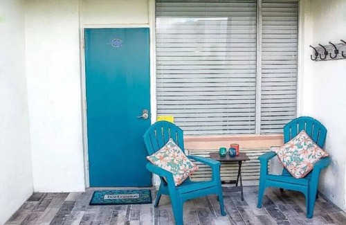 Our cozy 420 sq ft. condo is steps from the main pool deck and the stairs down to the sand on 'World’s Most Famous Beach'. It is perfect for couples or small families. As a 1st floor condo, it allows for easy loading/unloading of your belongings. Positioned just behind the oceanfront units, it offers a partial ocean view from a charming outdoor patio.
