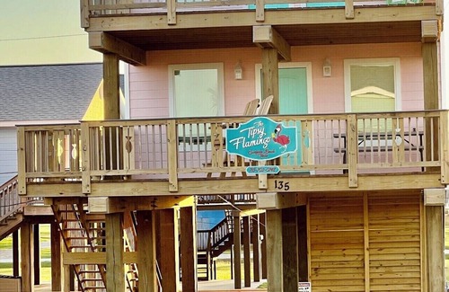 This property is located on the Beach Side of Bluewater Highway 1.7 miles from the Surfside Bridge and only steps away from the water. You do not have to cross Bluewater Highway to access the beach. There are two large decks with unobstructed views of the gulf and the bay. The upper decks are accessible from both bedrooms.