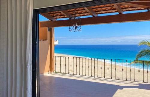 A newly remodeled upscale beachfront penthouse with the unbeatable panoramic ocean views this top-floor corner unit offers. The two-bedroom home is conveniently located between the busy Cabo San Lucas and artsy San Jose del Cabo on the most desirable beach.
