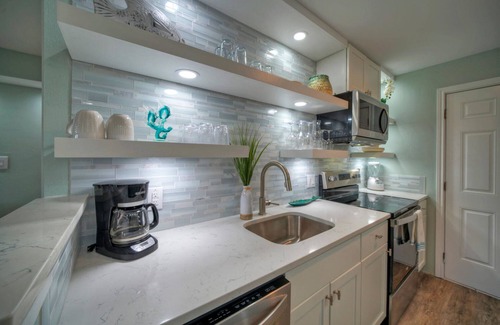 Beach Happy is a spacious studio with everything you need for the perfect beach getaway. The newly renovated interior welcomes you with coastal vibes, adorned in blue beach-inspired decor. Four guests can enjoy a restful night's sleep with a king bed and a full sleeper sofa, while the full bathroom ensures convenience for everyone. The fully equipped kitchen makes cooking a breeze. Sip your coffee at the breakfast bar, or step out to the balcony to start your morning with sea breeze and sweeping views.