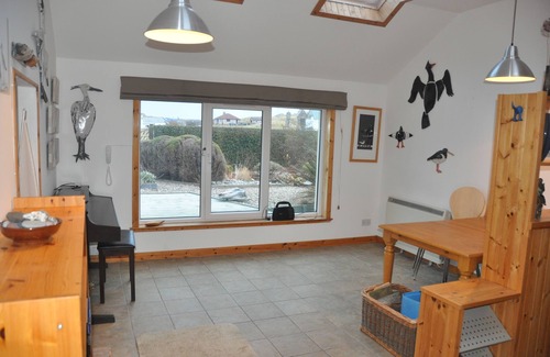 Spacious holiday house with stunning views on the beautiful Valtos Peninsula. Sleeps 8 in 4 bedrooms. Fully equipped kitchen, cosy sitting room with wood-burning stove, 2 bathrooms, conservatory. 1 minute walk to beach and pier, with many other beautiful beaches within easy reach. Family and pet friendly, the house is perfect for bird watchers, nature lovers, beachcombers, sandcastle builders, kayakers and hardy swimmers!