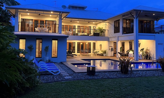 Ease into a tropical holiday in this massive, absolute beachfront, 8 bedroom home on the Cairns northern beaches catering for multi-family / group stays for up to 16.