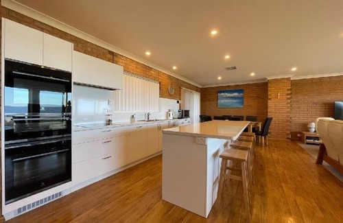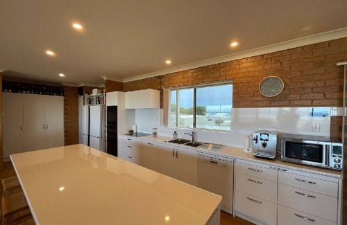 The newly renovated and fully equipped upstairs kitchen, with island bench, has everything guests need to cook up a storm. Plenty of fridge and freezer space is available in twin bottom mount fridges. There are 2 full size, high end Electrolux ovens, one also a steam oven, a smaller oven/grill, and a Miele induction cooktop. There is a Weber hooded barbecue and 12 seater outdoor dining setting on the front undercover balcony. There is a dishwasher to help with the clean up afterwards. On the ground level there is a kitchenette with fridge/freezer, sink, microwave, electric jug and toaster.