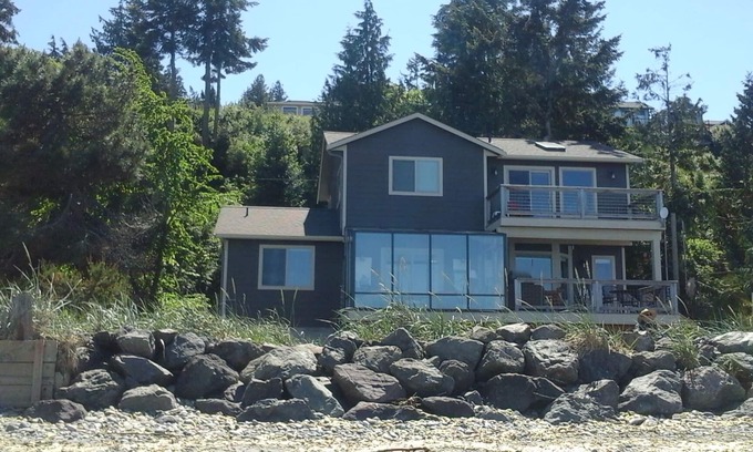 SUNROOM FOR ALL SEASONS. 50 feet to beach. Three bedrooms, Two Full Bath. Sunroom is a plus either rainy or windy. Located right on the water shoreline in Diamond Point, boarder line of Jefferson County and Callam County. Front of the house has a covered porch with a beautiful door to the 1st floor of the house. Entry way leads to the right is bedroom with a King size bed renewed 10/31/2023 with two windows facing water . bathroom has bath/shower combo with glass sliding doors. Middle of the house is: Living room with sliding door leads to large deck and Sunroom overlook the water. To the left is dining room with bay windows facing the ocean. Fully equipped granite kitchen cooking oil spices with stainless steel appliances. Laundry room has front load washer and dryer soap provided. The stairs leads to upstairs:another living space with its own sliding door to the upper deck; also skylight in the room for night star gazing. Two bedrooms:one Queen bed with 2 water view windows, the other queen bed with 2 territorial view. One full bath:shower, bath combo with glass sliding door.The neighborhood is very quiet and peaceful to wake up to the water gently lapping the shore. Resident Eagles perching on the piling. Beach combing, Sea life gazing(full of surprises), Birds watching, Or gazing in the distance to see ships gone by. Never a dull moment. Hiking trails in the neighborhood. Discovery Trail starts from Diamind Point.