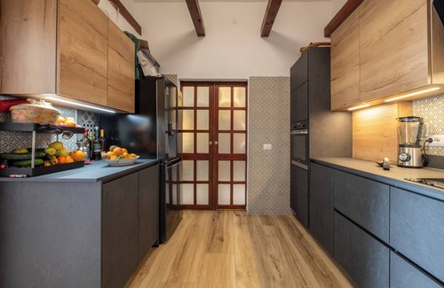 Adjacent to the living area is a modern kitchen, with wood and stone effect furniture, which overlooks the veranda and garden.