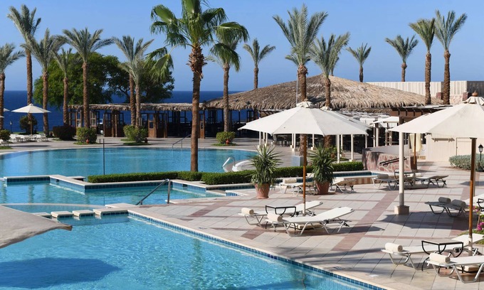 Nestled on the cliff-top and beachfront at Ras Om El Sid in Sharm El Sheikh, all-inclusive stay with 3 pools (including a kids’ pool), spa, fitness center, tennis, beach volleyball, sauna, steam room, and private beach access. Onsite kids club, water sports (snorkeling/diving), archery, and nearby desert safaris or Ras Mohammed Park complete the experience.