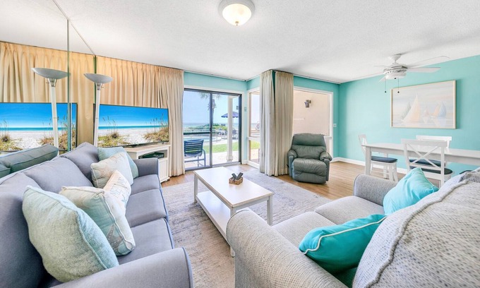 Welcome to your next vacation spot, Latitude 29 #13 .This unit is ground floor; so a short walk out the back door and you are on the sugar white beach of the Gulf of Mexico. With a king bed in the bedroom, bunks in the hall and two queen sleeper sofas, this condo comfortably sleeps up to 6 people.The fully remodeled kitchen, with stainless appliances, offers everything you need to cook breakfast, lunch, or dinner for the whole group. The living room has flat screen TV, DVD player and a second bathroom. Come visit the “Best backyard on the Beach” at Latitude 29 #13.