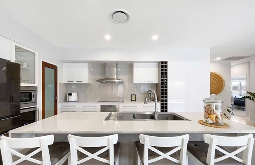 Entertaining friends and family will be a breeze from the central heart of the home. The modern kitchen features an island bench with dual sinks, dishwasher. Four-burner Electric cooking, range hood, plumbed French door fridge, chilled wine cabinet, and ample benchtop and storage space plus wine glass display cupboard and liquor cabinet. Extra appliances include coffee maker and Phillips Air Fryer.