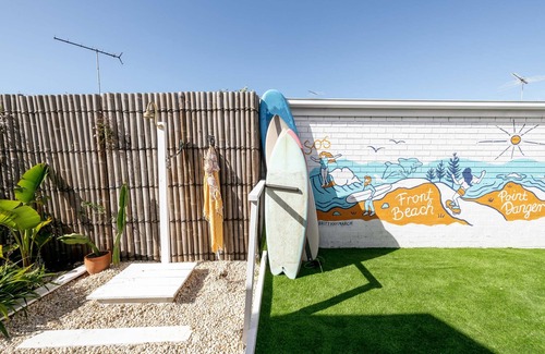 From the moment you arrive, you will be greeted by palms, cacti and an outdoor shower. A bamboo fence-line is the backdrop to tropical gardens and relaxed holiday vibes, leading to a backyard that offers restful spots to sit, swing, cook, lay and play.