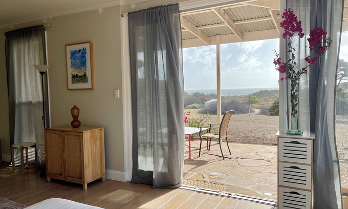 This bright, airy studio apartment offers a spacious living and bedroom area, kitchenette, and large en-suite bathroom. Enjoy a sundowner on your own patio with BBQ that has farmland and sea views. With only a short walk to the beach this centrally located studio is on Kangaroo Island's north coast and is perfect for exploring the island. Fully self-contained, private with your own entrance and car park. Next door to one other guest accommodation on one side.