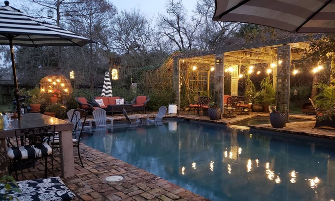 The Birdcage Saloon offers a private saloon, terrace and courtyard. This 1800's carriage house has a spacious open floor plan that embodies the charms of its original era. This is a 1400 sq ft two story carriage house with a saloon on the first floor and bedroom on top floor. The name Birdcage Saloon is a saloon, decorated to look like 1800 to early 1900's with many original pieces of art no detail was left untouched from the card table to the back of the bathroom doors, art is everywhere along with a custom made fifteen foot bar. The bar is equipped with a wine frig, ice maker, sink and anything else you would need in a bar. (bring your own liquor) There is plenty to do in this room with a pool table, card table etc. Also you will find a full bath with huge walk in shower with three shower heads one is a huge rainfall shower head.