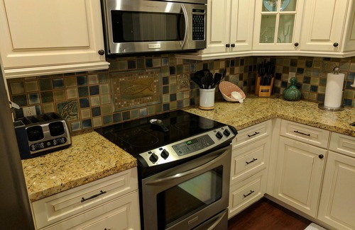 The spacious, tropically furnished master bedroom opens up to a 500 square foot screened in balcony and also has its own bathroom with shower views of the palm trees and water. The second bedroom shares its full bathroom with the rest of the home. Both bedrooms are very quiet and have lots of natural light and very comfortable queen size beds. If you need another bed, there’s a full size convertible couch in the living room, and it has a very comfortable mattress, so you’ll be sure to get a great night’s sleep!