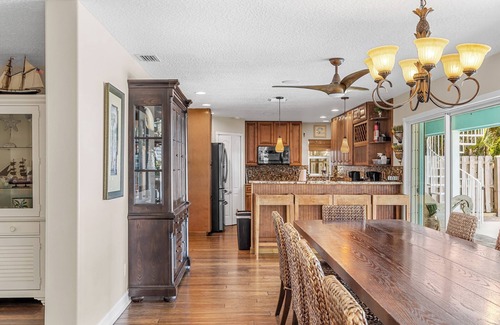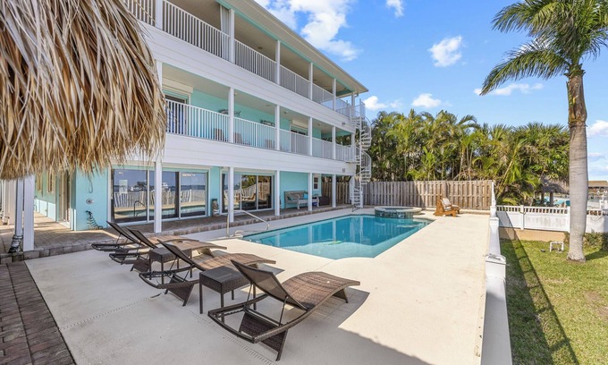 This Beautiful 3 story home is located directly on the Indian River. Just a 15-20 minute boat ride away from Sebastian Inlet, with a private dock. This home has 3 Bedrooms, 4.5 baths, and a balcony on each floor. This home is perfect for family or friends vacation, featuring a pool and Jacuzzi, along with a great outdoor area for cooking out, or lounging around underneath a custom made Tiki Hut. The first floor consists of a living room with a queen size pull out sofa, dining area with a custom made farmhouse table that seats up to 13 people, fully functioning kitchen, laundry room and half bath. The second floor has another living room with a sectional sofa, flat screen tv, mini bar, pool table, two bedrooms, and two bathrooms. The first bedroom on the second floor has a king bed and bathroom. The second bedroom has two bunk beds that can sleep up to 4 people, and a private bathroom. These two bedrooms share a deck overlooking the Indian River. The second floor is also equipped with a Day bed and a Trundle bed in the living area. The third floor consists of the master bedroom which is furnished with a king size bed, walk in shower, large tub, and private deck also overlooking the Indian River. Attached to the master suite is an extra room which includes a twin size bed, and a bathroom, that is accessible by walking thru the closet of the master bedroom, and also has a door that opens to the third floor outside deck, for different access. This home is equipped with paddle boards and kayaks as well. Feel free to bring your own boat, or there are boat rentals in the area. Parking: There is not a lot of space for parking, the driveway including the garage can fit around 4-5 vehicles. There is no space for a boat trailer, however you can keep your truck&trailer at the boat ramp next door or rent a parking slip from Treasure Coast Marina next door. No pets. Service animals upon request. Guests must be 25+ to rent home. Please review our rules and policies. No events/parties allowed. If you have any questions regarding this policy, please feel free to contact us.