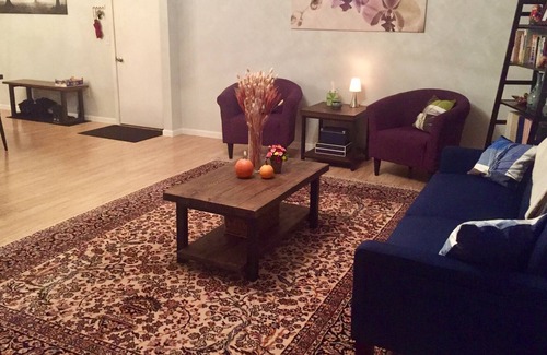 A spacious open-concept living-dining room features a gorgeous antique oriental rug, reclaimed wood coffee and end tables, a Scandinavian-style navy couch that unfolds into a double bed, a reading corner with eggplant-colored chairs and a beautiful oak dining table to seat 6-8 people.