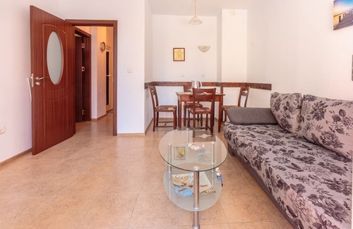 2-bedroom apartment in Sunny Beach. The apartment consists of 1 bedroom, bathroom with toilet, living room, dining room, and separate kitchen. All rooms are fully furnished. Additional amenities: free WiFi, satellite TV with over 200 channels, air conditioning, and barbecue. The apartment is located on the ground floor in a quiet area 200 meters from the beach.