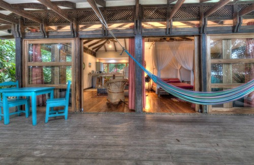 Casa Caracola is a very beautiful, uniquely designed and comfortable beach front bungalow. It is set within a large private garden with a gate leading directly onto the golden sands of the famous Cocles beach. This house is one of the few in the area to be situated in a highly prized beach front plot, as most are situated on the other side of the road. The house has beach, sea and jungle views. This is a self contained open plan, 1 bedroom bungalow.