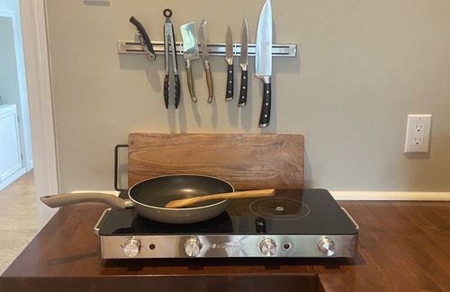 Inside, you’ll find a sun-drenched living space with a spacious king bedroom, a brand-new pull-out king sleeper sofa for extra guests, and a fully stocked kitchen featuring a Nespresso machine, two-burner hot plate, toaster oven, and elegant coastal accents.