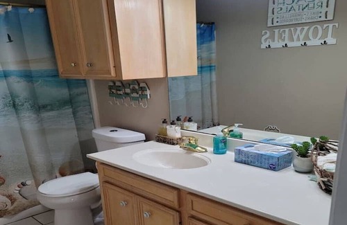 Take it easy at this unique and tranquil getaway. This charming beach house has plenty of vintage charm, and it's located 5mins from the Walmart shopping center and restaurants. You'll enjoy this peaceful 4 bedrooms and 2 bathrooms with a pool up to 8ft for those whom like to swim. Master suite with King size bed off to it's own... This