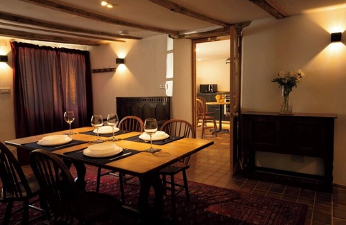 On the ground floor the beautifully lit mill machinery provides a spectacular backdrop for the dining room, with access to a private terrace overlooking the garden and river. The neighbouring kitchen is newly fitted with dishwasher, washer/drier, fridge/freezer, etc. On the first floor the lounge has two pairs of original millstones and an oak beamed ceiling, with a wood burning stove and a plentiful supply of wood.