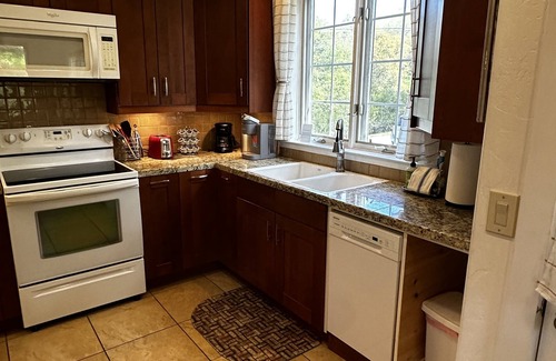 If you are seeking a well designed and outfitted home base for your couple’s retreat then Redtail Cottage should not be missed. It is a “Guest Favorite” with five star reviews given by every guest since it first listed in 2018. The setting is leafy and beautiful, close to the village shopping but remote and just a few miles up the road from Sequoia National Park. Guests tell of breakfasts on the private deck while watching quail families and bunnies romp on the private road; and dinners watching the sunset after grilling on the front porch just outside of the kitchen door. The Cal-King bed is wonderfully comfortable and the high end linens and black out curtains guarantee a fabulous rest after long hikes in the National Park. The kitchen is fully equipped with stove, oven, microwave, full size frig, dishwasher, coffee/tea service area and all the expected accessories with helpful spice selections. There are two AC/heat units on separate thermostats and even your own private washer and dryer with all the supplies. There is a darling English replica propane fireplace, two smart tvs and even a Tesla series 2 EV charger (TeslaTap adaptor is in the cupboard for universal charging). The free wi-fi is yours alone so you can download and share your pictures with friends and family and sign in to your video accounts. The cell service is also good so work or play Redtail Cottage offers you all of the comforts of a well designed one bedroom/one bath separate home in 780 square. Feet.