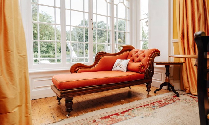 The grand entrance hall features stunning hand painted walls and original tiling. From here the drawing room, with large windows overlooking the large gardens and crochet lawn is a perfect entertaining space . There is a large dining table and a wonderfully cosy seating area in front of the large fireplace. There is also a large TV, cleverly disguised as a mirror above the fireplace. Popcorn and movie nights are a must!