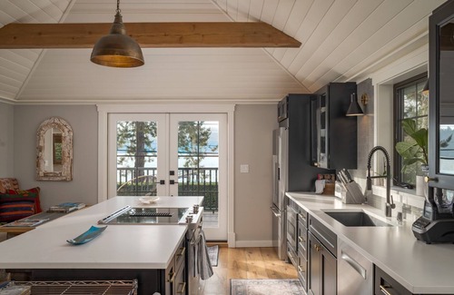 Enjoy unforgettable views of Puget Sound from our covered Lanai or deck off kitchen. A double set of french doors right off the kitchen open up onto the trex deck with a panoramic view of puget sound. Guests love to open up the doors to bring in the fresh sea air. From the deck, you can take the stairs to the grass yard.