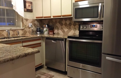 Approx 1300 sq feet. Recently remodeled! New All Stainless Steel Appliances!French door Fridge with Icemaker-New Convection range Microwave & Dishwasher! Crown moldings, granite countertops, tiled backsplash, knockdown on walls & ceilings. Completely furnished. Linens, towels, dishes, cooking utensils, storage containers, complete cutlery, knives, stove, and microwave. Full kitchen with dishwasher.