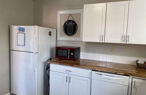The kitchen includes a refrigerator, stove, microwave, Keurig coffeemaker, blender, toaster, cookware, pots and pans, wine glasses, and a wine opener. There are plenty of dishes and silverware for a nice dinner or a family breakfast. You will also find coffee, creamer, sugar, green tea, hot chocolate, oil, salt, and pepper.