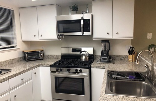 Beautifully fully furnished private apartment with new hardwood floors throughout the unit. The Apartment contains the following for use while staying here: Stove, Refrigerator, linens, bedding, fully stocked kitchen, Keurig, Ninja blender, microwave, toaster oven, TV, Internet equipment, bed sets, 5 lamps, couch, and more. Golden Hills is a family friendly area of Tehachapi and Dial A Ride bus service is available to take you into town or other areas of Tehachapi for shopping and dining. This gorgeously remodeled unit is set in the middle of a six-unit complex with a large lawn, trees and parking. The living room and kitchen are spacious and have a mountain view. There is a washer and dryer facility on-site. You will have a single car garage to park your car. This is a well maintained, pet friendly building with long term respectful tenants. The exterior is thoroughly cleaned weekly by dedicated cleaning personnel. The property is also landscaped weekly.