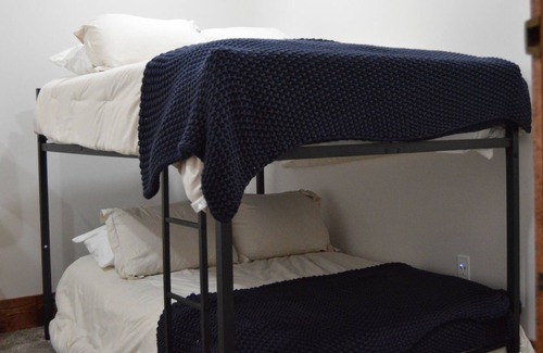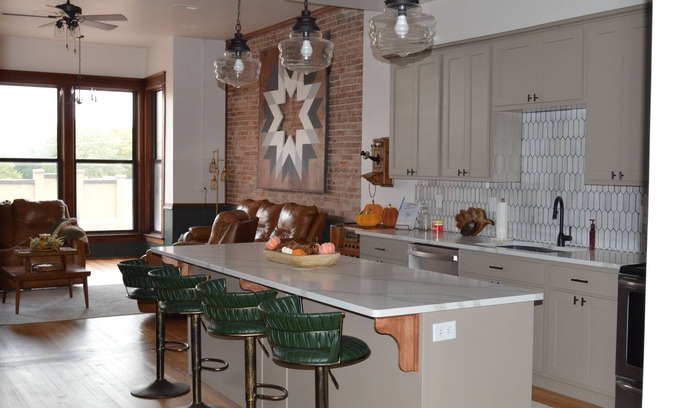 Recently renovated in 2023. This beautiful downtown apartment sleeps up to 10! Bedroom 1 provides two king beds, while bedroom 2 provides one queen and a set of full-sized bunk beds. Each bedroom is equipped with a smart tv that is hooked directly to Wi-Fi. The bathroom has a large walk-in onyx shower. All towels are provided. The kitchen hosts luxurious quartz countertops with a large island for entertaining. Pots, pans, coffee pot, glassware, dinner plates, silverware are all provided. In the living room you can oversee Seneca's historic main street from the large bay window. The apartment also includes a private deck off of the back. Come enjoy a vintage style with luxury finishes.
