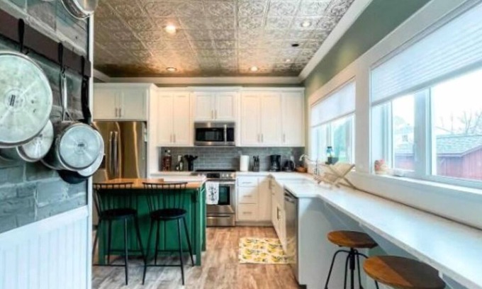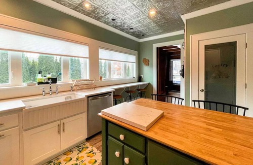 The space is a luxurious manor built in 1913 that has been fully renovated and restored with original woodwork preserved. Lots of natural light makes it a very photogenic home, and it's a great “getting ready house” for a bridal party. The brand new chef's kitchen has matted quartz countertops, stainless appliances, with island and breakfast bar seating for 5. The dining room table seats 6, and the living room has seating for 6-7. Bathrooms are ample-sized, with an oversized spa tub in the upstairs bathroom. Bedrooms are outfitted in luxury linens with extra pillows and high quality mattresses. An empty dresser is provided in each room to accommodate longer stays. The yard is large and fairly private, with lots of areas to entertain and room for pets to run.