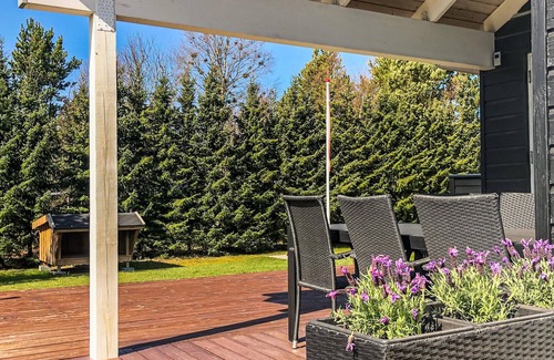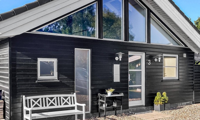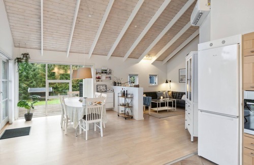 In a beautiful vacation home area, not far from the harbor town of Hals, this bright and appealing house welcomes you. It is the perfect place to take a break from your hectic everyday life and enjoy the benefits of the homely ambience. The open-plan living area, with high ceilings, large panoramic windows and good, well-maintained furnishings, promises you plenty of time for cooking together, playing games at the dining table or movie nights on the sofa. A whirlpool bath is available for relaxing hours of wellness.