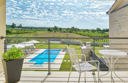 This beautiful family villa in Labinci near Porec leaves nothing to be desired. Villa Clara Melodie consists of 3 bedrooms and 3 bathrooms. One bedroom is located on the first floor, while the other two are on the upper floor and have access to the beautiful balcony overlooking the pool area and offer a great view for a good start to the day. All bedrooms, just like the rest of the house, are comfortable, stylish and furnished with great attention to detail. The bedrooms are air-conditioned and have a television. The center of the first floor is the colorful living room. The kitchen is fully equipped and has a dining area for 8 people. Directly from there you can access the garden and the inviting pool area. An outdoor dining area and a charcoal barbecue are at your disposal if you want to cook and enjoy your meal outdoors. The shade under the parasols invites you to relax and enjoy your vacation. The villa's convenient location allows easy access to the coast and the picturesque hinterland, while a store and restaurant are just a short walk away. Please note: Youth and party groups are not allowed.Labinci is a small village just a short drive from Porec. Porec is the tourist hotspot of the area, known for its beautiful beaches and rich cultural heritage and also offers sports facilities and gastronomic and entertainment amenities. The stunning Euphrasian Basilica is the symbol of this coastal town. Sunsets in Porec are also worth seeing. The nearest beach is about 7 km from the villa. As the coast is easily accessible by car, you have many different beaches to discover. Near Porec you will find one of the best water parks in Istria - Aqualandia, where a day of fun for the whole family is guaranteed. The inland of this part of Istria offers many hiking and cycling trails as well as many opportunities to discover the small towns of Istria and their cultural and gastronomic specialties. If you want to explore central Istria, you must visit one of the charming hilltop towns such as Groznjan or Motovun and enjoy the view of the breathtaking surroundings.