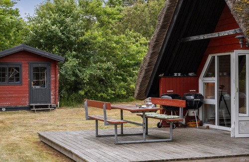 Experience relaxing days on the North Sea island of Rømø in this traditional holiday home. The house is secluded in a small wood and offers you plenty of peace and privacy for a relaxing holiday with the family. Make yourself comfortable in the cosy living room with its exposed beams and rustic wooden walls. Play cards together, read a book or prepare a delicious dinner in the open-plan kitchen. The cosy corner bench in the dining area invites you to enjoy long meals in convivial company. Large windows provide plenty of light and a beautiful view of the greenery.