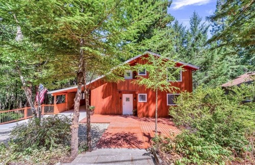 Happy luxury home in the Redwoods. Curl up on the deck with a book by the fire pit while listening to the bubbling brook. Or stay inside and enjoy the view of the redwoods though floor to ceiling cathedral windows. Play pool by the fire downstairs or curl up and watch a movie next to the fireplace in the living room. The trails are right outside, lined with flowing brooks, and many varieties of mushrooms. Golf and frisbee golf are a block away. Two lakes are just a ten minute stroll away, one is stocked with trout for fishing. This lovely home is just what you need to reset.